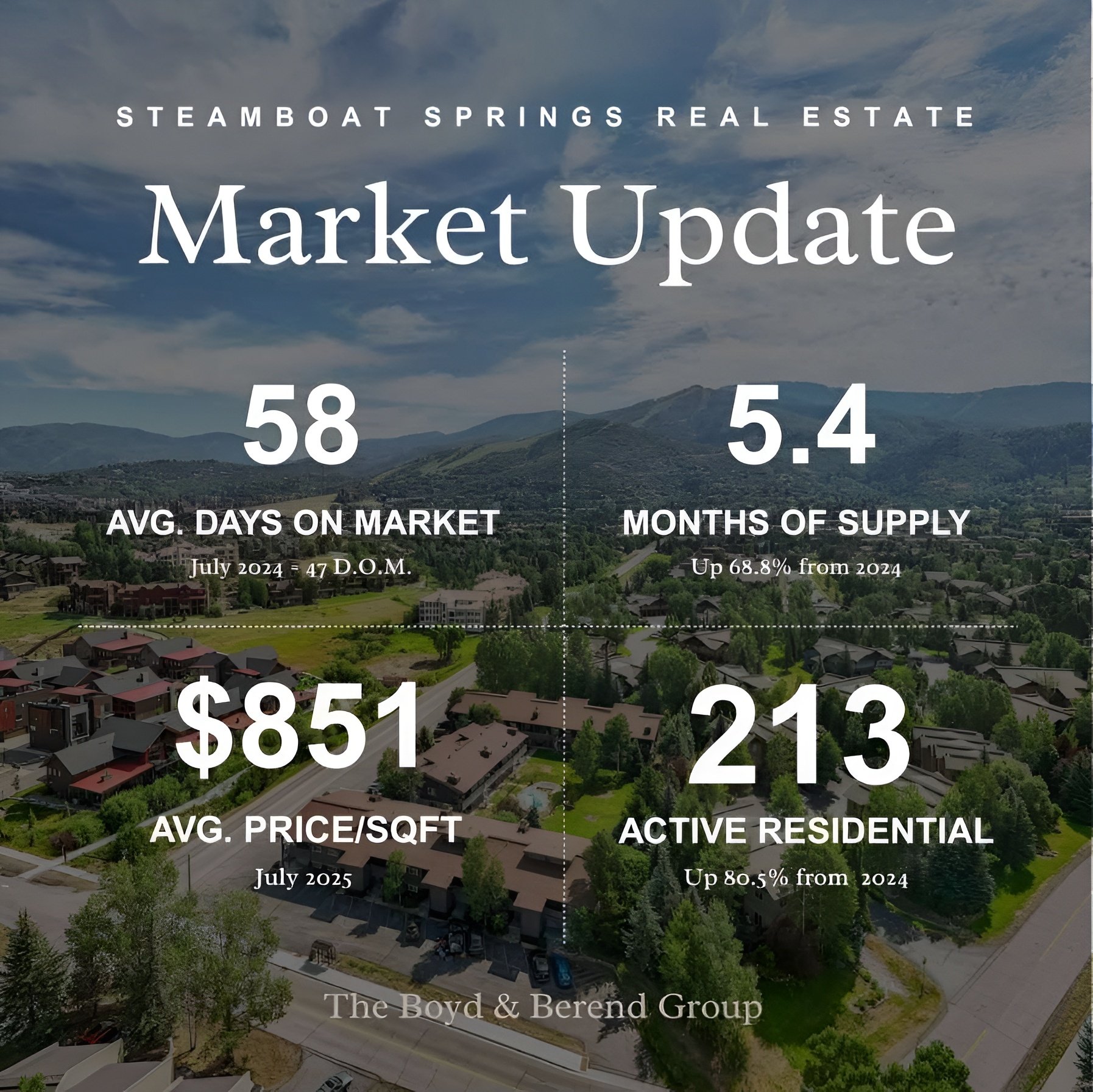 The Steamboat Springs real estate market in July reflected a gradual shift toward a more balanced environment, with increased inventory and slightly slower buyer activity compared to last year. Homes sold in July spent an average of 58 days on the market, 11 days longer than June 2024's 47-day average. At the end of last month, there were 213 active listings. This marks a 80.5% increase in total inventory compared to July 2024. Months of supply rose to 5.4, up from 5.2 last month and 68.8% higher than the same time last year-signaling a move away from the competitive seller's market of recent years. Buyer activity has softened, with showings per listing averaging at 3 in July, a 16.7% drop from last year. For buyers, this means more options and negotiating power, while sellers should focus on competitive pricing and standout presentation to attract attention in a more competitive landscape.